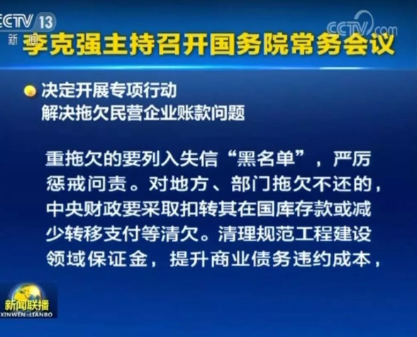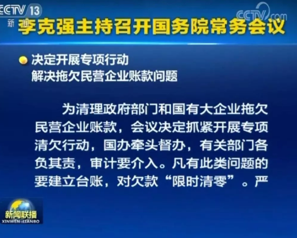 為清理政府部門和國(guó)有大企業(yè)拖欠民營(yíng)企業(yè)賬款,會(huì)議決定抓緊開展專項(xiàng)清欠行動(dòng),國(guó)辦牽頭督辦,有關(guān)部門各負(fù)其責(zé),審計(jì)要介入。凡有此類問題的要建立臺(tái)賬,對(duì)欠款“限時(shí)清零”。嚴(yán)重拖欠的要列入失信“黑名單”,嚴(yán)厲懲戒問責(zé)。對(duì)地方、部門拖欠不還的,中央財(cái)政要采取扣轉(zhuǎn)其在國(guó)庫存款或減少轉(zhuǎn)移支付等清欠。清理規(guī)范工程建設(shè)領(lǐng)域保證金,提升商業(yè)債務(wù)違約成本,嚴(yán)防新的欠款。清欠情況明年春節(jié)前向國(guó)務(wù)院報(bào)告。