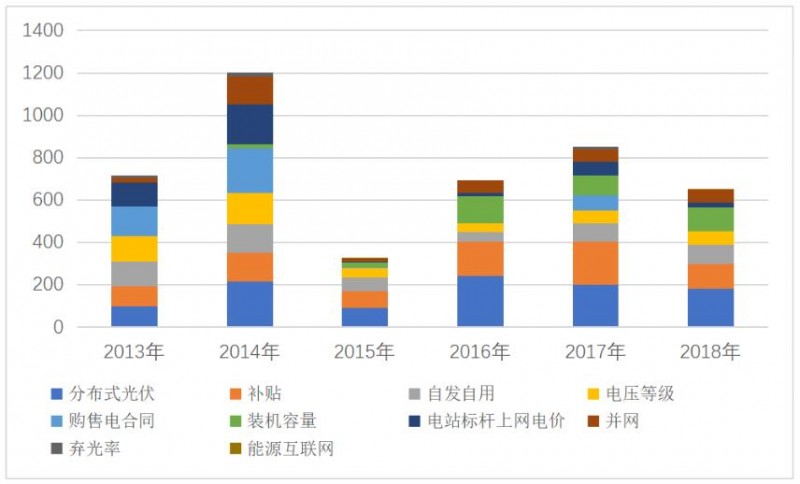 從政策文件高頻詞分布來看,從2013年至2018年,除分布式光伏外,補(bǔ)貼提及的頻率最高,貫穿整個分析過程,由此涉及分布式光伏政策發(fā)展的過程中,補(bǔ)貼仍然是主要的方向,但提及次數(shù)在減少,說明國家還是在慢慢退出市場,平價上網(wǎng)成為主流。除此之外,自發(fā)自用的比例也較高,從側(cè)面自發(fā)自用可能是未來國家對于分布式光伏的發(fā)展模式的思路。而從年度分布來看,2014年相關(guān)詞的出現(xiàn)頻率較高,政策發(fā)布較為密集。
