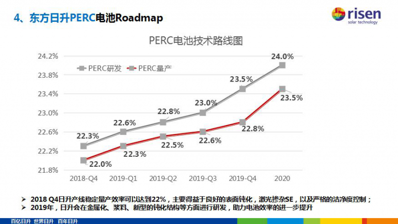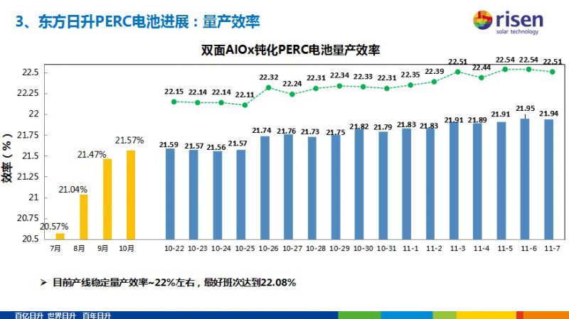 東方日升是全球首家雙面AlOx鈍化PERC電池量產(chǎn)實(shí)現(xiàn)GW規(guī)模(——2GW)的企業(yè)。2018年,公司通過選擇性發(fā)射極、氧化、鈍化、金屬化等一系列工藝上的優(yōu)化,最終在雙面AlOx鈍化PERC電池量產(chǎn)效率上取得實(shí)質(zhì)性突破。目前,東方日升雙面AlOx鈍化PERC電池平均效率突破22.19%,產(chǎn)線最高效率達(dá)22.51%。
