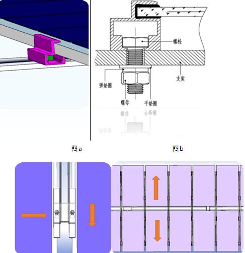 略高于檁條(見圖 a 和圖 b)。夾塊底部采用六角型快速安裝槽口,安裝時(shí)將六角螺栓頭放入壓塊槽口, 滑動(dòng)螺栓進(jìn)入壓塊內(nèi)腔后會(huì)滑動(dòng)到指定位置(見圖c和圖d)。由于內(nèi)腔尺寸相對(duì)約束,這樣在安裝時(shí)只 需要單側(cè)使用扳手緊固,即可完成對(duì)組件的安裝,相對(duì)傳統(tǒng)壓塊安裝更加便捷。