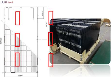 1. 設(shè)計(jì)原理與成本優(yōu)勢(shì) 本文以六點(diǎn)安裝為示意,紅框內(nèi)為鋁塊,如下左圖所示:新設(shè)計(jì)組件安裝方式是在常規(guī)組件安裝壓塊的位置取消外置壓塊,直接利用 6 或 4 個(gè)鋁塊,用傳統(tǒng)鋁合金邊框組件的加工工藝,組件在生產(chǎn)出庫(kù) 前直接用膠黏貼在組件長(zhǎng)邊框的安裝位置。如此以來(lái),通過(guò)調(diào)整組件背部檁條、主梁的固定方式及相對(duì)位置,可以最大程度實(shí)現(xiàn)組件背面無(wú)遮擋,將雙面組件的增效達(dá)到最大值,并且可靠性高,可實(shí)現(xiàn)節(jié)省 0.1 元/W 邊框成本。不僅如此,因?yàn)閴簤K在工廠進(jìn)行預(yù)安裝(見圖右),使得電站現(xiàn)場(chǎng)安裝組件快速便捷,降低項(xiàng)目人工成本。
