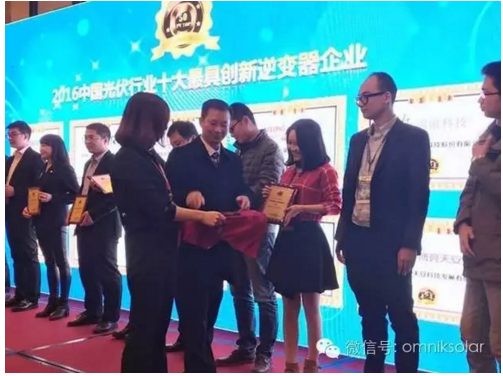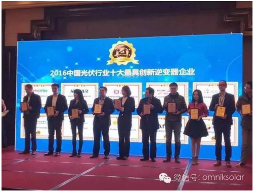 2016年11月29日,上海淳大萬麗酒店舉辦中國光伏產(chǎn)業(yè)創(chuàng)新與發(fā)展高峰論壇,同期也舉辦了2016中國光伏行業(yè)最具創(chuàng)新力企業(yè)50強(qiáng)榜單發(fā)布及十大頒獎典禮,在各大媒體、行業(yè)協(xié)會專家和企業(yè)的見證下,蘇州歐姆尼克新能源科技有限公司榮獲“2016中國光伏行業(yè)最具創(chuàng)新力企業(yè)50強(qiáng)”、“2016中國光伏行業(yè)十大最具創(chuàng)新逆變器企業(yè)”兩大獎項,蘇州歐姆尼克市場部方媛經(jīng)理代表公司上臺領(lǐng)獎。